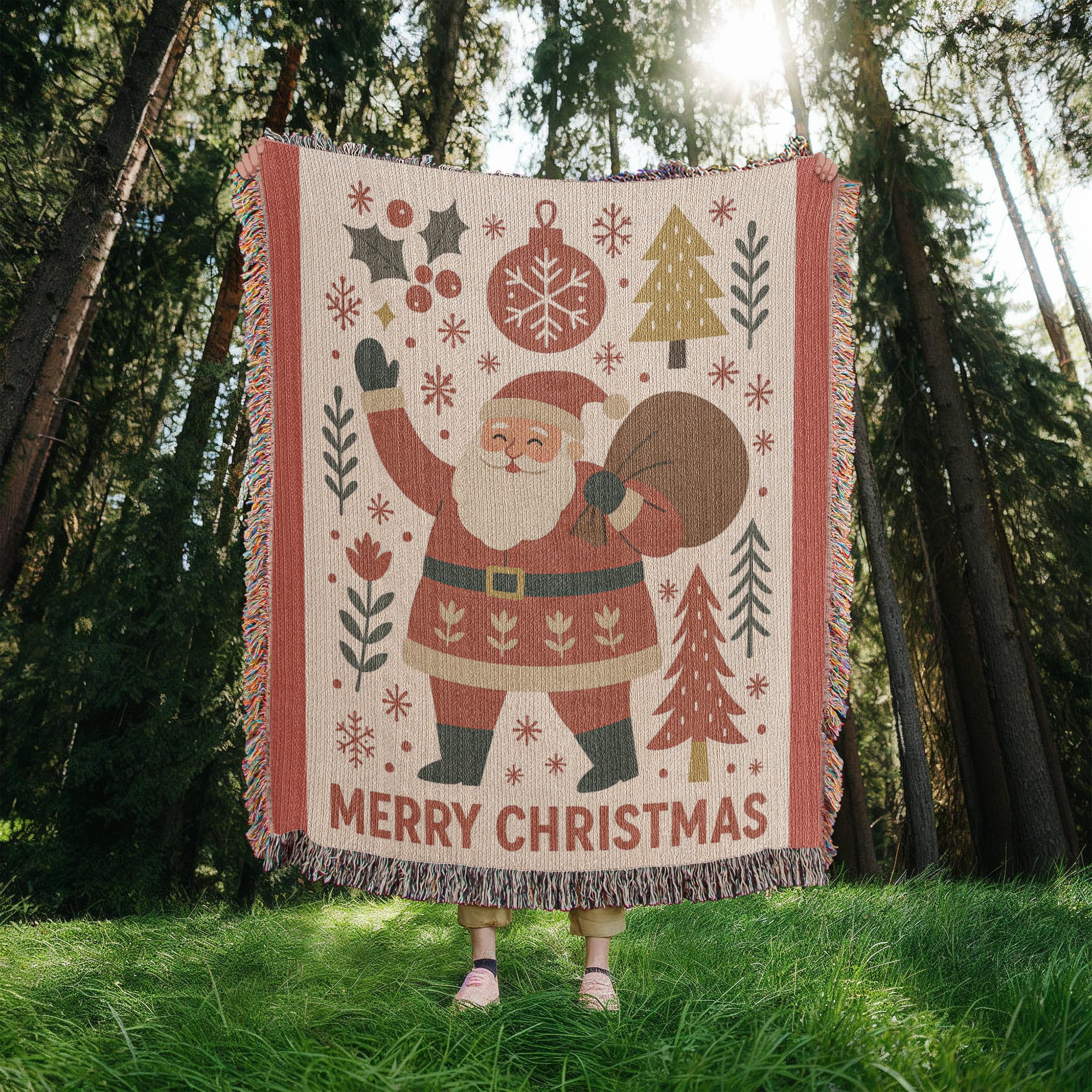 Celebrate the magic of the season with the “Merry Christmas Santa” Heirloom Woven Blanket! Featuring a charming, folk-art style Santa carrying his festive sack and surrounded by snowflakes, holly, and pine trees, this cozy throw captures the heartwarming nostalgia of a classic Christmas. The cheerful “Merry Christmas” message makes it perfect for spreading holiday joy in any home.